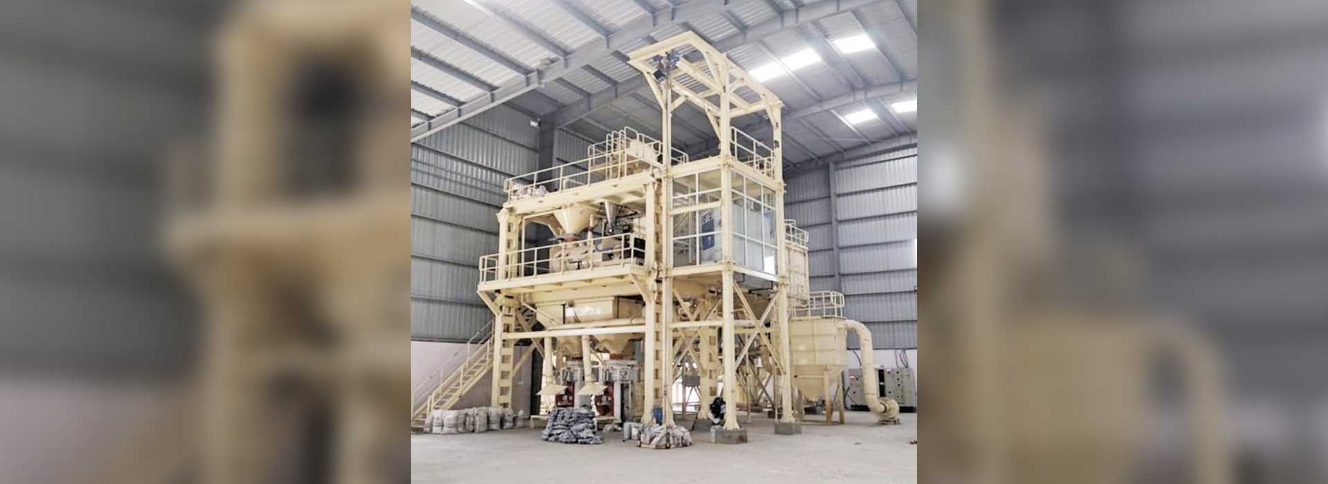 The finished goods packing and storage section– It is at the base level of the structure. In this section, the final product batch from the mixer is automatically discharged into a holding hopper and packed in bags by the packing machine. These bags are then conveyed to stockyards through a bagging conveyor.
